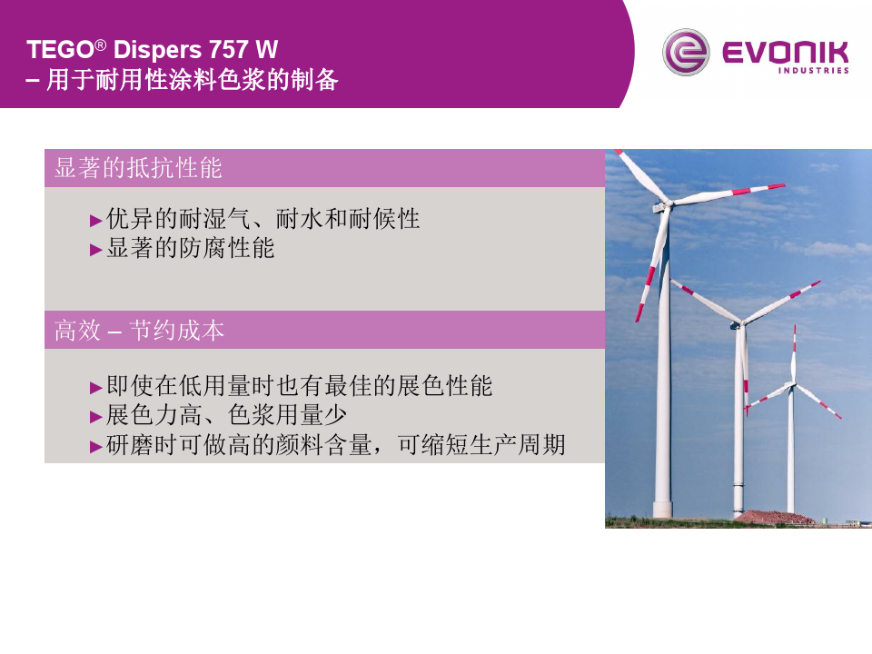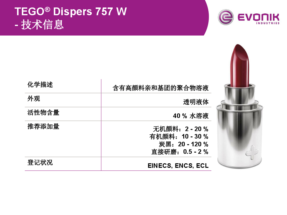 01. > > > TEGO 分散劑 性能 < < < > > > TEGO 757 低的吸水性 < < 03. > > > TEGO 757 的耐鹽霧性能 < < < 04. > > > TEGO 757 節(jié)約成本 < < < 05. > > > TEGO 757 優(yōu)異的相容性 < < < 06. > > > TEGO 757 水性高性能涂料首選 < < < 07. > > > TEGO 757 技術(shù)信息 < < < 08. > > > TEGO 757 有機(jī)顏料參考配方 < < < 09. > > > TEGO 757 無(wú)機(jī)顏料和炭黑參考配方 < < < 10. > > > TEGO 757 產(chǎn)品說(shuō)明書(shū) < < < TEGO 757分散劑 索樣熱線18688841669張先生 佛山三升貿(mào)易 TEGO 740W 分散劑 產(chǎn)品鏈接 高性價(jià)比型 TEGO 760W 分散劑 產(chǎn)品鏈接 碳黑降粘型 TEGO 752W 分散劑 產(chǎn)品鏈接 啞光和透明氧化鐵防沉性優(yōu)異用于耐用性涂料色漿的分散劑