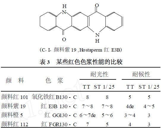 如果需要鮮艷的紅色或淡紅色用于外墻乳膠漆,且性能與氧化鐵紅相接近,可使用顏料紅122或顏料紫19。顏料紫19有6種晶型,有多種商品牌號,Hostaperm紅E3B(γ型) 是最適宜的品種,因?yàn)槠渚哂凶吭降哪秃蛐院湍凸庑?。某些紅色色漿性能的比較見表3。