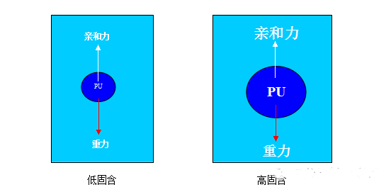 從以上圖我們可以看到,聚氨酯粒子能夠在水中穩(wěn)定存在是依靠粒子自身重力和粒子與水的親和力的平衡。若親和力大于或等于重力,則粒子可以穩(wěn)定存在,樹脂亦可穩(wěn)定;若親和力小于重力,則粒子沉降,樹脂則發(fā)生沉淀或分層。